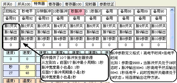 脈沖發(fā)生器的使用 在程序中,我們只需要控制脈沖開(kāi)關(guān)狀態(tài)就可以了,同時(shí)把脈沖輸出映射到端子上,外部端子就可以獲得脈沖輸出 。 脈沖參數(shù)可以預(yù)置或者在程序中動(dòng)態(tài)修改。 脈沖發(fā)生器 ![]() 端子映射 ![]() |
