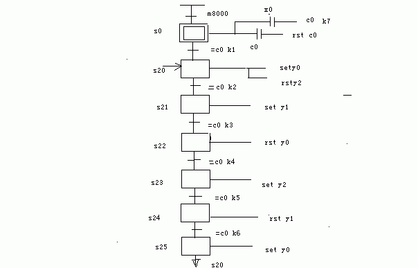 用步進指令,同一按鈕X0,每按一次一步,為A-AB-B-BC-C-AC-A循環。圖可行嗎?Y0,Y1,Y2,分別對應A,B,C。現在問題是A要多走一步如何改進?