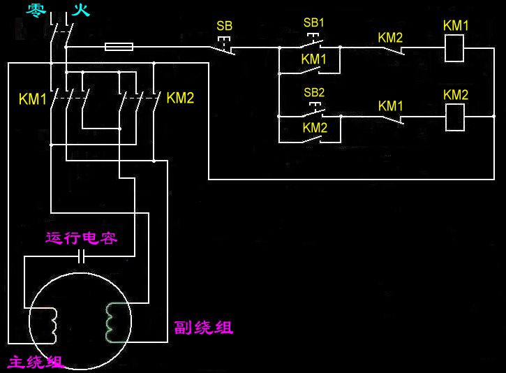 原理是這樣的, 單相電機要改一下線圈接頭,副線圈及主線圈的兩邊接頭都引出來,通過兩個繼電器的轉變,正轉是副線圈頭與主線圈頭共接,反轉是副線圈尾與主線圈共接(電容式的,副線圈的另一頭是接電容的)這樣就可以正反轉了。
