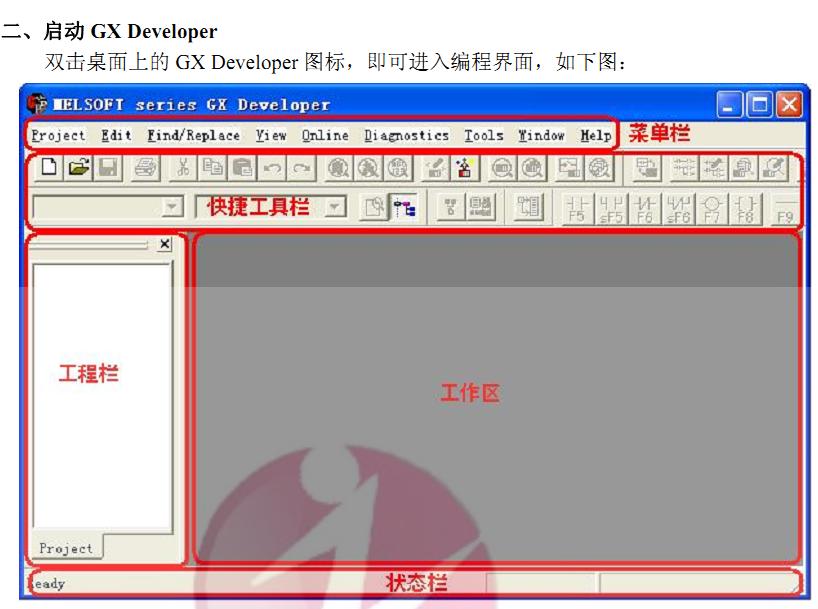 其最上面區域為菜單欄,點擊后可彈出下拉菜單選擇相應指令;菜單欄下面為快捷工具欄,可以自行調整各項工具;工作區為程序編寫的主區域,程序就顯示在該區域;工作區左側為工程欄,顯示項目的相關信息,如程序結構、軟元件注釋、PLC參數和網絡參數等;最下面為狀態欄,顯示GX Developer的狀態信息,如CPU類型、編輯模式狀態等。