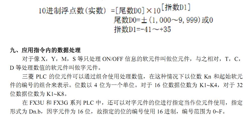 對于用戶而言,這種二進制浮點數(shù)的表示形式不易理解,所以可以將其轉(zhuǎn)換成十進制浮點數(shù),十進制浮點數(shù)也占用編號連續(xù)的一堆數(shù)據(jù)寄存器,但它分為尾數(shù)和指數(shù)兩部分,例如對于十進制浮點數(shù)(D1,D0)而言: