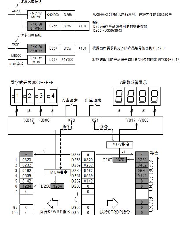 SFWR指令和SFRD指令配合接口實(shí)現(xiàn)先入先出的控制。所謂先入先出,可以想象產(chǎn)品儲(chǔ)存到倉庫的庫位中,按照入庫的順序排列好,在取貨時(shí)根據(jù)入庫的先后順序優(yōu)先拿取先入的產(chǎn)品。如以下梯形圖實(shí)例: