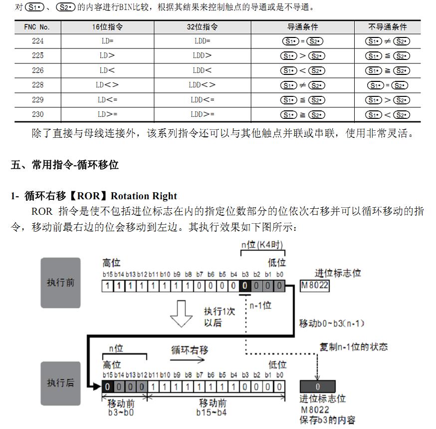 該指令對于以D開始的n1個(gè)字軟元件往右移動(dòng)n2個(gè)字,移位后,原最右側(cè)n2個(gè)字軟元件的數(shù)據(jù)溢出,左側(cè)n2個(gè)字軟元件數(shù)據(jù)由S開始的n2個(gè)字軟元件數(shù)據(jù)補(bǔ)充。