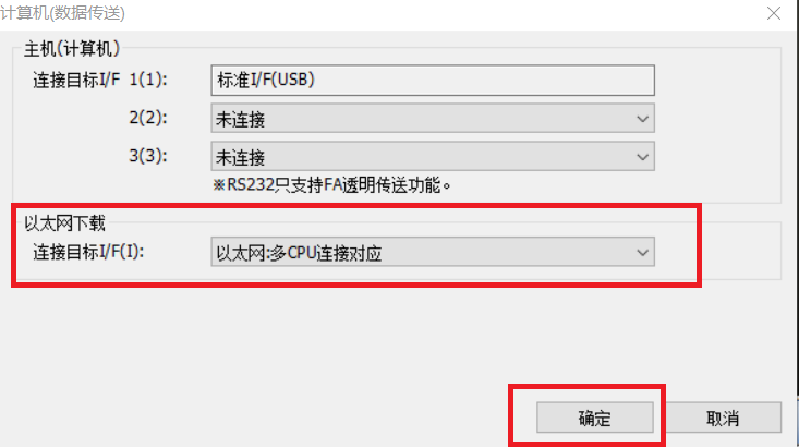 2、在彈出的小窗口下方,以太網下載 連接目標I/F 把未連接改成 以太網:多CPU連接對應