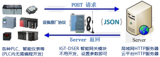 智能網(wǎng)關(guān)IGT-DSER集成了多種PLC的原廠協(xié)議,方便實(shí)現(xiàn)各種PLC與服務(wù)端之間的HTTP協(xié)議通訊,通過網(wǎng)關(guān)的參數(shù)配置軟件綁定JSON文件的字段與PLC寄存器地址,配置URL,選定周期模式或者觸發(fā)模式,即可通過POST命令,將JSON文件提交給HTTP的服務(wù)端; 如果服務(wù)端有返回的JSON,網(wǎng)關(guān)進(jìn)行解析后將數(shù)據(jù)寫入到PLC,實(shí)現(xiàn)PLC與HTTP服務(wù)端雙向通訊。 網(wǎng)關(guān)模塊詳細(xì)資料