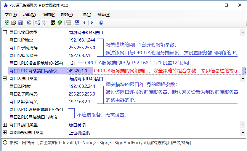 首先,通過網關的參數設置軟件設置IP地址、OPC服務端等參數,由‘功能’->‘網口參數編輯’進入如下界面: