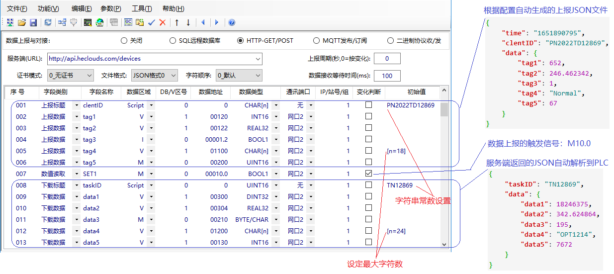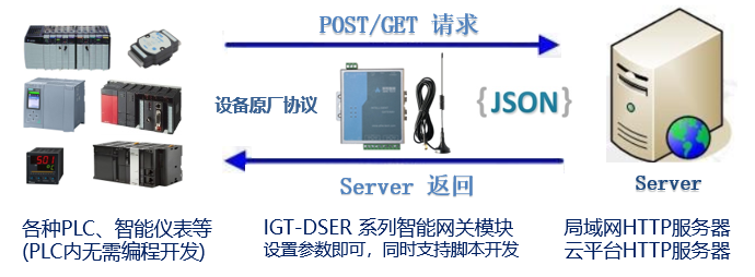 智能網關IGT-DSER集成了多種PLC的原廠協議,方便實現各種PLC與服務端之間的HTTP協議通訊,通過網關的參數配置軟件綁定JSON文件的字段與PLC寄存器地址,配置URL,即可通過POST/GET命令,將JSON文件提交給HTTP的服務端; 如果服務端有返回的JSON,網關進行解析后將數據寫入到PLC,實現PLC與HTTP服務端雙向通訊。