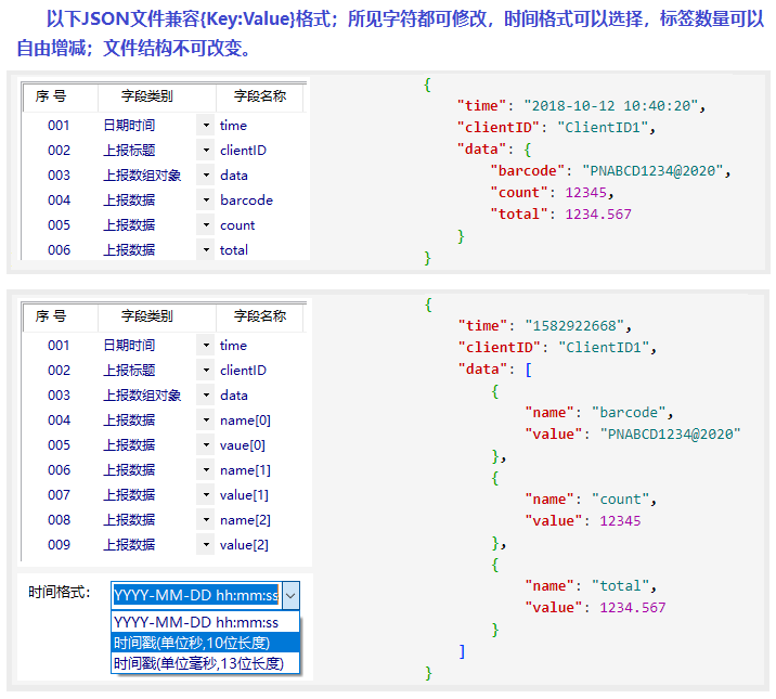 網關支持多種工作模式:周期模式是按設置的周期時間提交POST請求和解析返回的文件;觸發模式可配置一個或多個觸發條件,網關根據觸發條件的數據變化進行JSON文件提交。