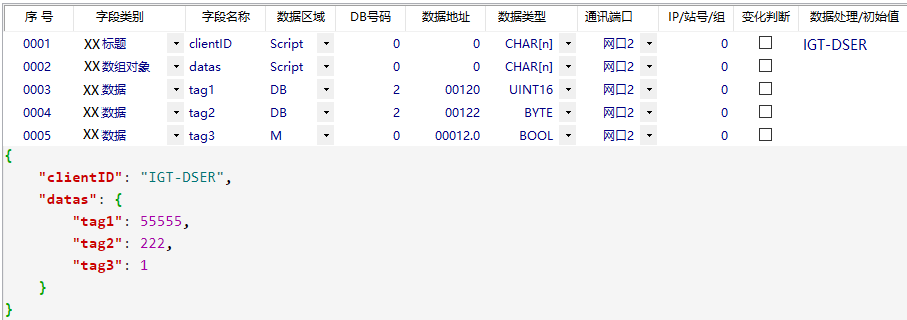以下是數據配置表自動生成的JSON文件的對應。JSON文件內的數據可以自由增減,字符可自由修改,舉例只是為了描述各種JSON文件的結構實現。MQTT協議的發布/訂閱也是同樣的對應方式。具體如下: