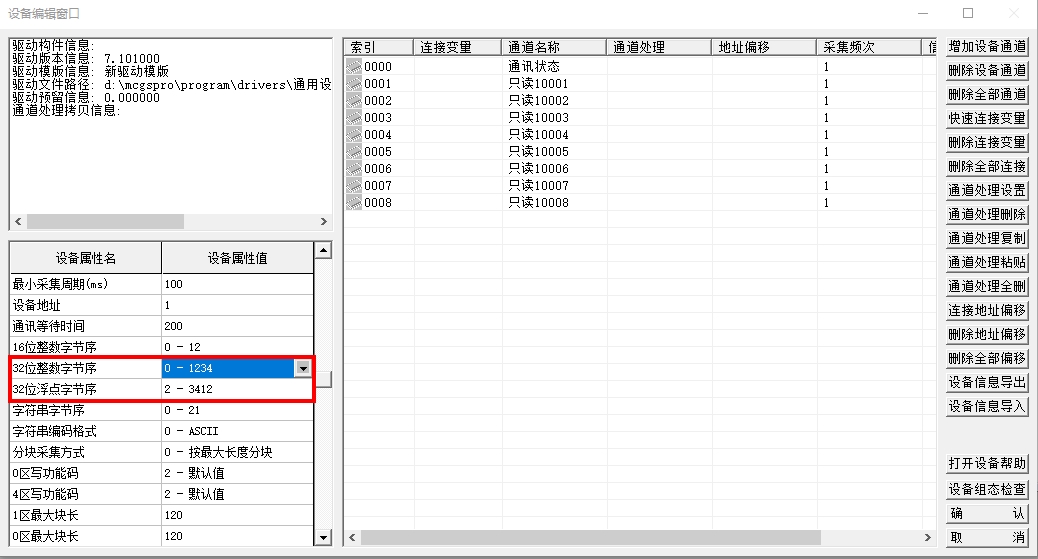 檢查以下設置:32位整數字節序,32位浮點字節序,即高低字節轉換設置。