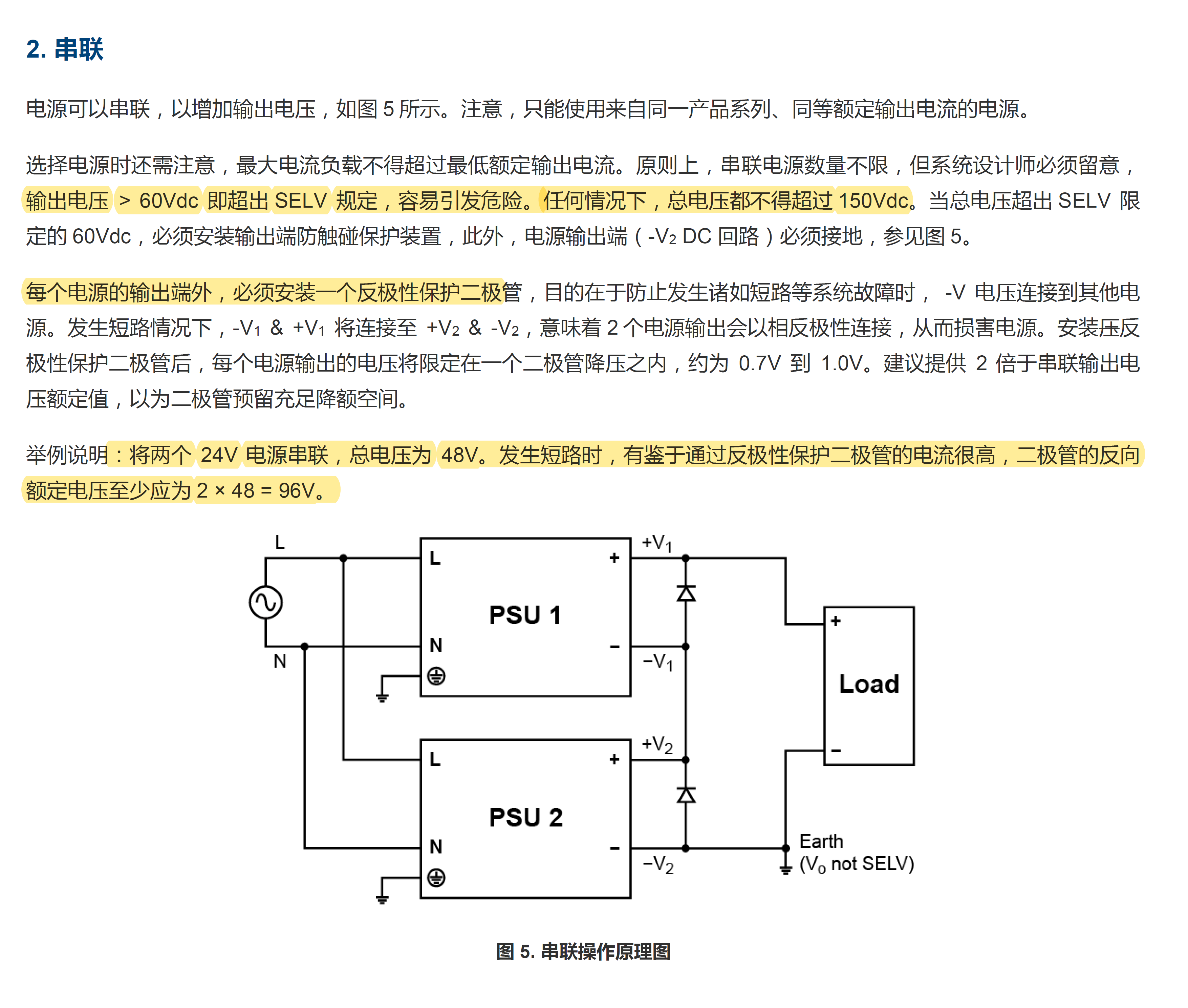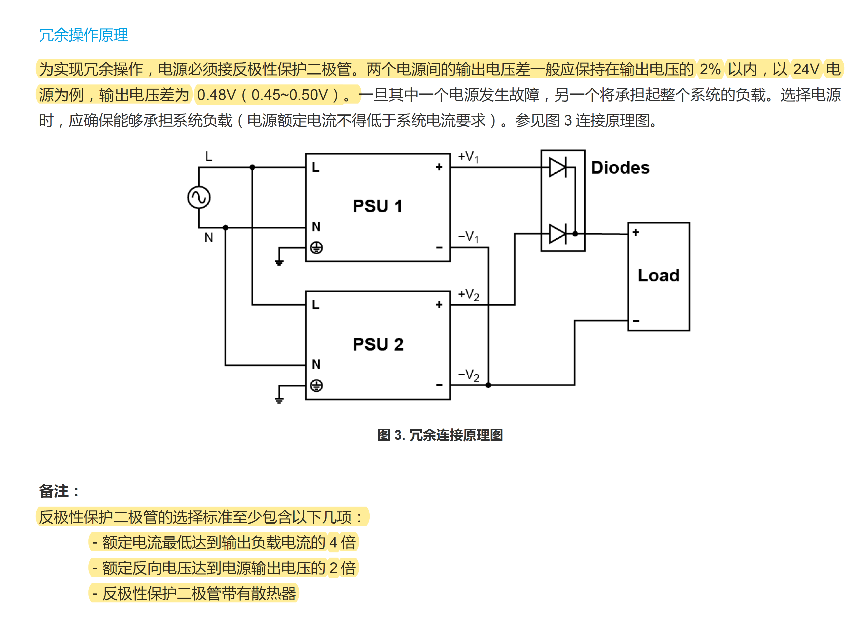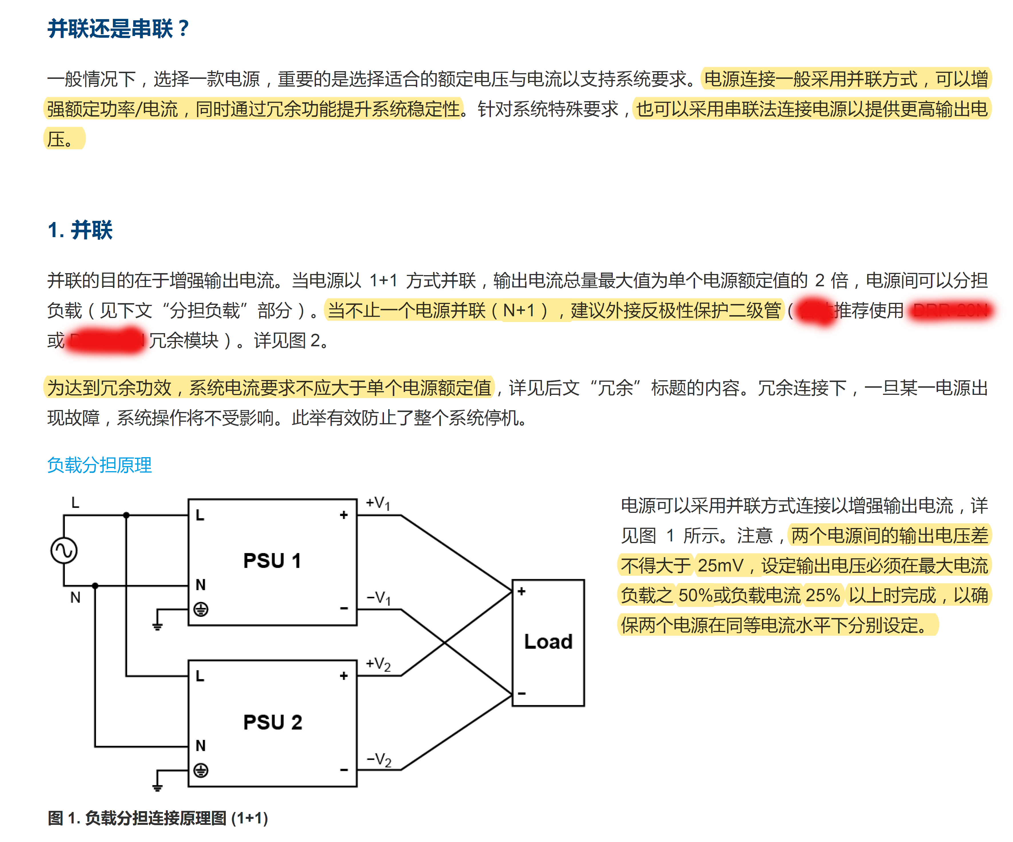 來(lái)自電源知名廠商的權(quán)威參考信息: ![]() ![]() ![]() 總體來(lái)講,電源串聯(lián)或者并聯(lián)都可以。 電源并聯(lián)(或冗余)另一個(gè)簡(jiǎn)單的方法就是直接使用電源冗余模塊,各個(gè)主流開(kāi)關(guān)電源廠家都有對(duì)應(yīng)的型號(hào),但是單個(gè)價(jià)格要一百多; 自行購(gòu)買(mǎi)大功率肖特基二極管模塊,可以節(jié)省一半到2/3的價(jià)錢(qián)。 [ 此帖被龍?jiān)评俗釉?025-09-17 11:52重新編輯 ] |