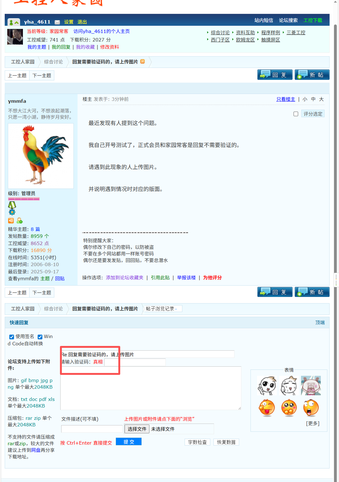 引用引用樓主ymmfa于2025-09-17 14:14發(fā)表的 回復需要驗證碼的,請上傳圖片 :最近發(fā)現(xiàn)有人提到這個問題。我自己開號測試了,正式會員和家園常客是回復不需要驗證的。請遇到此現(xiàn)象的人上傳圖片。.......