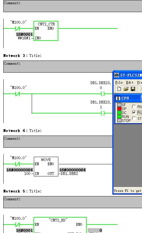 網(wǎng)絡(luò)5:調(diào)用FC4(CNT2_RD),執(zhí)行讀數(shù),W#16#1同樣是指定DB塊號。