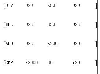 寄存器 D20除以常數500存到寄存器D30;下面是乘和加;寄存器之間運算,最后將數值存D20。最后比較常數2000與D0數,然后根據比較數觸發M20,當2000>D0,M20=1,當2000=D0,M21=1,當2000<D0,M22=1