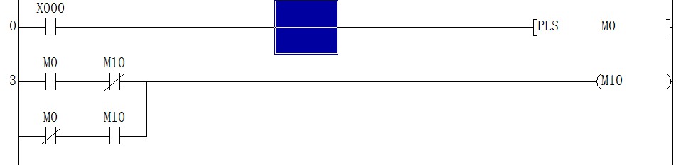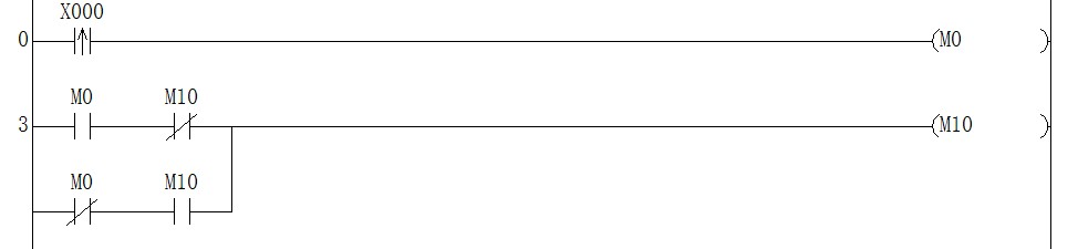 這個電路利用PLC的掃描周期實現功能M10交替動作的,當按下X0,M0的一個掃描周期動作,當M0動作通過M10的常閉使M10動作.當下個周期來的時間,M0失電,M0的常閉串聯M10的常開使M10維持有電,