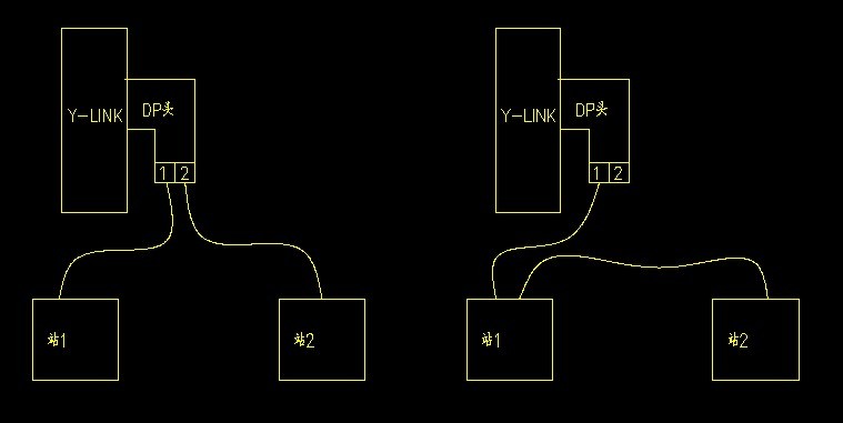 按照西門子profibus-dp協議只能是右圖能夠通訊。同時需要把Y-LINK;站2的DP頭終端電阻開關打到ON位置。